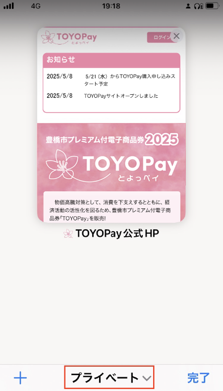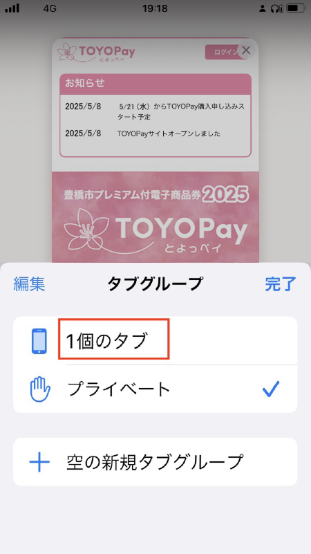 3. 画面下の「プライベート」をタップして、「タブグループ」リストを表示。