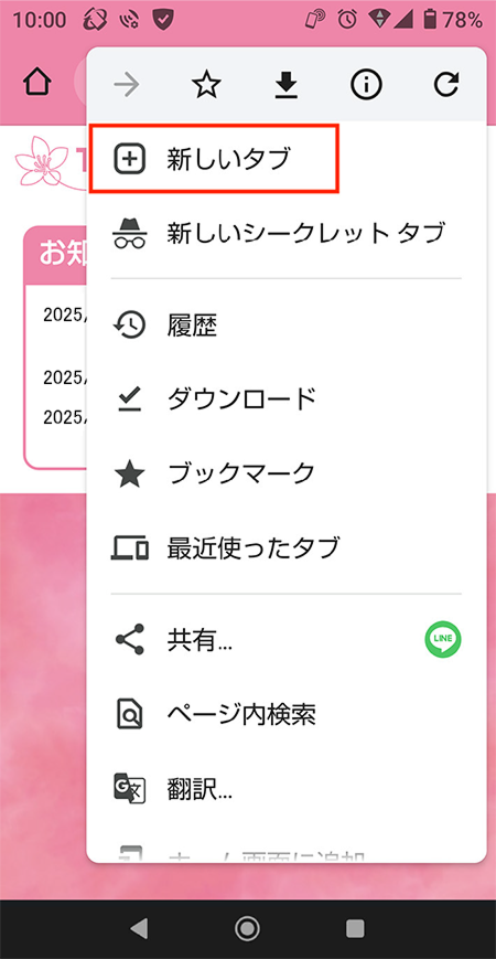 ※Android5.0以降の場合、画面上部を指で下にスワイプして、「すべてのシークレットタブを閉じます」を選択すると、全てのシークレットタブが終了する。5.[+]もしくはメニューから「新しいタブ」を追加してTOYOPayのサイトを開く。
