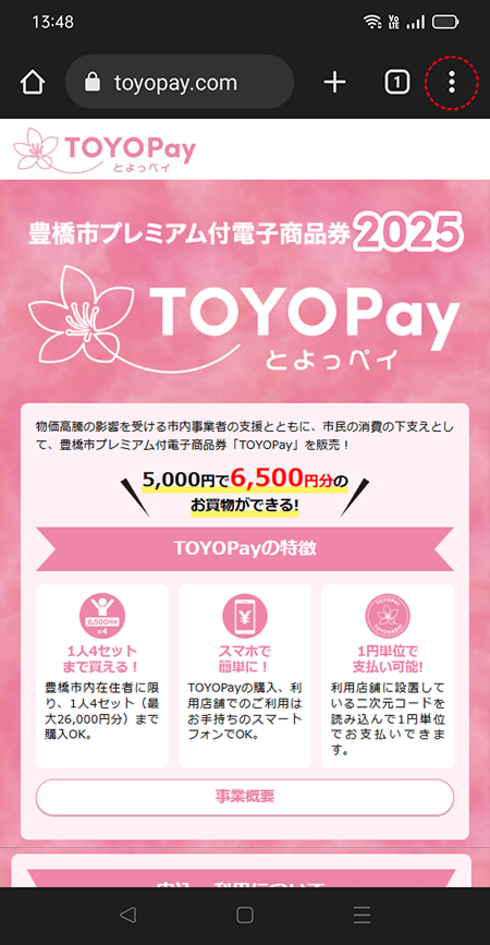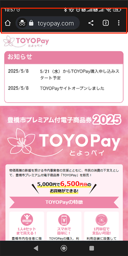 URLのリンクなどからインターネットへ接続する際、初期設定で「Yahooアプリ」もしくは推奨ブラウザ以外のブラウザ、アプリが立ち上がるケースがございます。そのままYahooアプリや他ブラウザでTOYOPayを開いた状態で利用すると、支払い時に二次元コードをスキャンするカメラが起動しません。推奨ブラウザのGoogleChromeもしくはsafariで開いていただきますようお願いします。