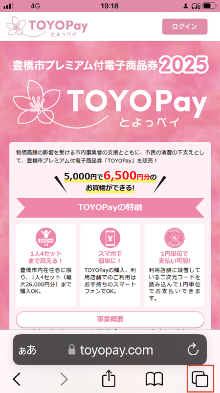 3. ページ右上もしくは右下の数字をタップし、タブ一覧を表示させる。